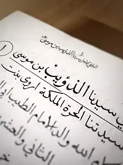 ![]() A page from a historical Dawoodi Bohra treatise displaying Syedna Dhu'ayb's name in Arabic | |