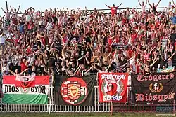 Diósgyőri Vasgyárak Testgyakorló Köre, more commonly Diósgyőri VTK (Hungarian: [ˈdioːʒɟøːri ˈveːteːkaː]) is a professional football club, part of the Hungarian sports club from Diósgyőr district of Miskolc. Founded in 1910 by the local working class youth, the club plays in the second division of the Hungarian League and has spent most of its history in the top tier of Hungarian football. Diósgyőr is best known for its passionate supporters – in the past years, Diósgyőr had one of the highest average attendances in the Hungarian top division.[1] The football club enjoyed its first golden age in the late 1970s and early 1980s, including a third-place finish in the 1978–79 season of the Hungarian League and two Hungarian Cup triumphs in 1977 and 1980.