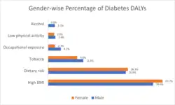 According to a survey conducted in 2016, the High body mass index (BMI) appeared to be the major risk factor contributing to 36% of diabetes DALYs. Besides, other risk factors, such as dietary risk, tobacco consumption, occupational exposure to passive smoke, low physical activity, and alcohol consumption, played a significant role as contributing risk factors.[1]