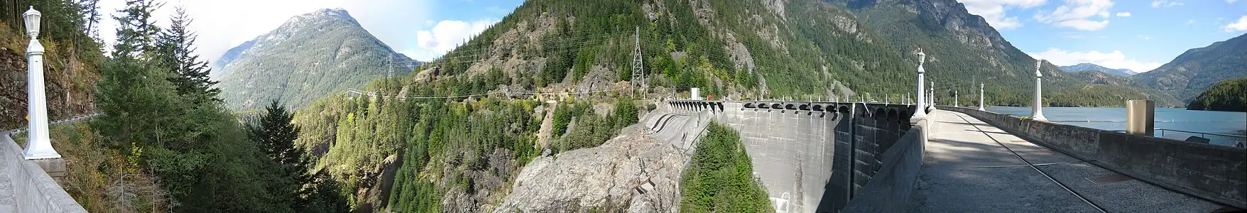 Diablo Dam is one of three dams along the upper Skagit River in Whatcom County, Washington and part of the Skagit River Hydroelectric Project that supplies Seattle with some of its power needs. The dam was built in Diablo Canyon, a gorge of solid granite with vertical walls rising 160 feet (49 m) from the river bed, yet were less than 100 feet (30 m) apart. Construction began in 1927, and was completed in 1930. The dam began generating electricity in 1936.[4]