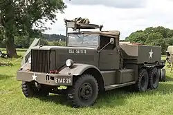 Model 969 Wrecker was the US Army's standard medium wrecker during World War II. It was equipped with the Holmes W-45 heavy-duty military wrecker bed with its twin boom and two 5-ton winches at the front of the bed as well as a front-mounted winch. A variety of other recovery equipment was carried, along with its own air compressor. It weighed 21,350 pounds (9,680 kg) and could tow 25,000 pounds (11,000 kg).[4]
