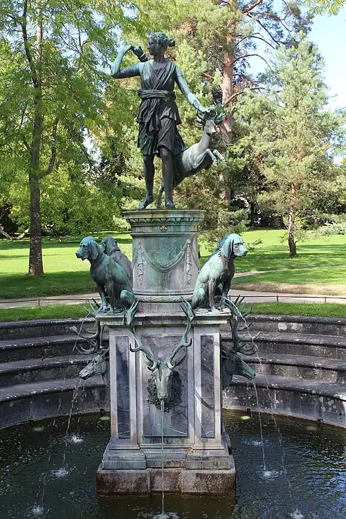 In 1605, after the marble Roman statue had been removed from Fontainebleau, Barthélemy Prieur cast a replacement, a bronze replica which was set upon a high Mannerist marble pedestal, part of a fountain arranged by the hydraulics engineer Tommaso Francini in 1603. The fountain incorporated bronze hunting dogs and stag's heads spitting water, sculpted by Pierre Biard, and was located in the Jardin de la Reine, with a parterre surrounded by an orangery.[16][17]