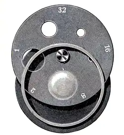 A Zeiss rotating diaphragm, 1906.[1] One diaphragm with five apertures.