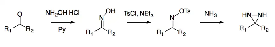 Diaziridines can be prepared from ketones by oximation, followed by tosylation (or mesylation), and then finally by treatment with ammonia (NH3). Generally, oximation reactions are performed by reacting the ketone with hydroxylammonium chloride (NH3OH−Cl+) under heat in the presence of a base such as pyridine.[5][6] Subsequent tosylation or mesylation of the alpha-substituted oxygen with tosyl or mesyl chloride in the presence of base yields the tosyl or mesyl oxime.[7] The final treatment of the tosyl or mesyl oxime with ammonia produces the diaziridine.[1][3][7][8]