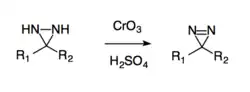 Diaziridines can be oxidized to diazirines by a number of methods. These include oxidation by chromium-based reagents such as the Jones oxidation,[10] oxidation by iodine and triethylamine,[5] oxidation by silver oxide,[11] oxidation by oxalyl chloride,[7] or even electrochemical oxidation on a platinum-titanium anode.[12]