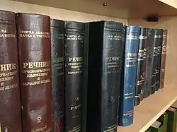 The dictionary was initiated in 1888 by Stojan Novaković, a member of the Serbian Royal Academy, in the centenary commemoration of the birthday of Vuk Stefanović Karadžić.[2] A sample volume was created by 1913, but further work on the dictionary was interrupted by the First World War, and later the Second World War, so conditions for steady work on it were realized after the founding of the Institute for the Serbian language in 1947. The publication of the Dictionary started in 1959, with a prominent Serbian linguist Aleksandar Belić as the editor-in-chief for the first volume, before he died in 1960. At the time, the official name of the language in Yugoslavia was "Serbo-Croatian". Since the break-up of Yugoslavia, the publication was continued by Serbia under the same name, despite the codification of its own "Serbian" language. It still contains and collects words from the whole area of Shtokavian dialects, i.e. words that now also belong to Croatian, Bosnian and Montenegrin standards.[3] The publication of the Dictionary is mandated by the Serbia's Law on the Dictionary of the Serbian Academy of Sciences and Arts (2005).[4]