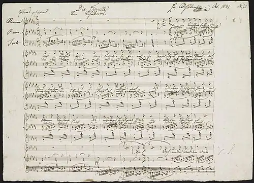 A third variation was written during the night of 21 February 1818. Schubert and Anselm Hüttenbrenner, a friend and fellow composer, had finished a few bottles of Hungarian wine when Anselm commented that his brother Josef was an aficionado of Schubert's work. Schubert completed a copy of "Die Forelle" that was "somewhat messy".[27] The messiness was partly accounted for by Schubert's drunken state, but also explained by the accompanying note he wrote to Josef: "Just as, in my haste, I was going to send the thing, I rather sleepily took up the ink-well and poured it calmly over it. What a disaster!"[27] The manuscript was held by the Hüttenbrenner family for a number of years and was photographed in 1870, before being lost.[3][28] Schubert wrote a further version in 1820 for publication in the Wiener Zeitung,[14] and a final copy in October 1821 for publication in the Neue Ausgabe. The final version has "a five-bar piano prelude"[29] and is presently in the Gertrude Clarke Whittall Foundation Collection of the Library of Congress.[30][31]