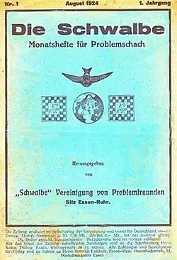 The magazine Die Schwalbe appeared the first time in July 1924.[2] Since that date it issues bimonthly. Only between 1943 and 1946 the appearance had been broken by the war. The then president of the society Wilhelm Karsch bridged that time sending all members Mitteilungen der Schwalbe (notes of the society). Die Schwalbe is worldwide recognised as a trade magazine. In the magazine chess compositions and solutions are published, composition tournaments announced and articles about chess compositions published.