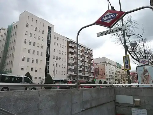 Diego de León [ˈdjeɣo ðe leˈon] is a station on Line 4, Line 5, and Line 6 of the Madrid Metro, located at the intersections of Francisco Silvela, Diego de León, and Conde de Peñalver streets in the Salamanca district of Madrid. It is in Zone A.[1][2][3]