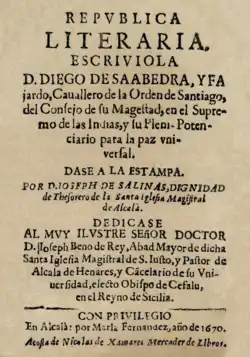 In 1640, Saavedra published the anti-Machiavellian emblem book Empresas Políticas. Idea de un príncipe político cristiano ("Political Maxims. Idea of a Christian Political Prince"), a hundred short essays about the education of a prince.[3][4] This work was written primarily for the son of King Philip IV. It passed through a number of editions and was translated in several languages. An unfinished historical work, entitled Corona gótica, castellana, y austriaca políticamente ilustrada, appeared in 1646. Another work ascribed to Saavedra, the República literaria, was published posthumously in 1670; it is a satirical discussion on some of the leading characters in the ancient and modern world of letters.[2] Saavedra's Idea de un príncipe político cristiano ("The Idea of a Christian political prince", 1640) was a very erudite work that uses the literary sort of emblem, put by Andrea Alciato with his Emblemata translated in 1549 and that has a mainly moral and philosophical character. His work, however, was mainly inspired by the Emblemata política (1618), by Jakob Bruck Angermunt, being the intention of the author to compose a guide for the suitable political formation of a Christian prince. As a historian wrote Corona gótica, castellana y austríaca (1648), that tried to be a biographical repertoire of the Visigothic kings of Spain.