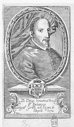 ![]() Diego Simancas. Anonymous intaglio engraving collected in Teatro eroico, e politico de'governi de'Vicere del Regno de Napoli, by Domenico Antonio Parrino, Naples, 1692-1695. | |