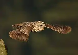 The tawny owl (Strix aluco) is an opportunistic and generalized predator. Peak hunting activity tends to occur largely between dusk to midnight, with owls often following an erratic hunting pattern, perhaps to sites where previous hunts were successful.[1][2] When feeding young, hunting may need to be prolonged into daylight in the early morning.[3][4][5] Based on hand-reared young owls that re-released into the wild, hunting behaviour is quite innate rather than learned.[6] Normally this owl hunts from a perch.[7][8][1] Perching bouts usually last from about 8 to 14 minutes depending largely on habitat.[2] Tawny owl's hunting from a perch or pole can recall a buzzard and the two take similar prey sizes as well. However, high initial speed and maneuvering among trees and bushes with great dexterity may allow it to surprise relatively large prey, more like a goshawk.[7][8] The tawny owl is capable of lifting and carrying off in flight individual prey weighing up to at least 320 g (11 oz).[9] Their middle talon, the most enlarged claw on owls, measures an average of 19.1 mm (0.75 in). While not as large as those of the Ural owl, the talons are extremely sharp, stout and quite decurved. The claws are considered to be visibly more overdeveloped than those of other European mid-sized owls and the footspan including the claws is somewhat larger as well, at an average of about 13.4 cm (5.3 in).[7][10][11] The hunting owl often extends its wings to balance and control prey upon impact.[12] Alternatively, this species may hunt from flight. This occurs from 2 to 3 m (6.6 to 9.8 ft) over the ground, often over open habitats such as bushes, marsh or grassland, forming a quartering or zigzag pattern over the opening. During these flights they cover about 30 to 50 m (98 to 164 ft) before changing direction.[13] Hunting from flight was surprisingly prevalent in a Swedish study of two radio-tagged birds, with 34% of study time spent hunting from flight while 40% of the study time was spent on hunting from a perch.[13] In a similar study in England, less than 1% of time was spent hunting from flight.[2] In a more deliberate variation of hunting from flight, the hunting owl may examine crags and nest boxes or also hover around prey roosts. In the latter type of hunts, the tawny owls may strike branches and/or beat their wings together in front of denser foliage, bushes or conifers in order to disturb and flush prey such as small birds and bats, or may dive directly into said foliage.[7][12][14][15] Hovering has also been recorded in differing circumstances, including one incidence of an owl hunting a small bird that was caught on the wing after a hovering flight.[16][17] Tawny owls have also taken bats on the wing as well (such as ones snatched from near streep lamps when attempting to hunt themselves) and have been seen to hawk large, relatively slow-flying insects such as some beetles and moths in flight.[7][14] Caterpillars may too be taken from trees.[14] Usually these hunting variations are correlated with poor weather hampering the capture of preferred prey.[1][18] Tawny owls eat worms with relative frequency, as they often hear them apparently from below the surface and snatch them up from shallow dirt or below leaf litter. Their worm-hunting style recalls worm hunting techniques by most other birds and they were recorded to eat 0.39 worms per minute during an hour of observation in England and were sometimes seen to feed on worms during daylight.[7][19][20][21] Other hunting from the ground has been observed, often of insects such as beetles, but tawny owls have also been reported to "leap" upon from a ground vantage point in order to capture a vole, quite like foxes often do.[7][22][23] There are now many accounts of tawny owls feeding on carrion from a wide range of sources, including hares, rats, sheep, and trout.[24][25][26][27]