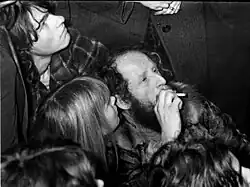 Kunzelmann was one of the founders of Kommune 1 in 1967.[12] In the late 1960s a series of militant and terrorist events were staged in West Berlin. Starting in autumn 1969 and continuing throughout the winter of 1970, 14 explosions have been recorded. Historians are arguing to this day, about whether Kunzelmann as key operator of the Far Left in West Berlin is to blame for instigating these acts of terrorism. Kommune 1 was a communal living group, that engaged in political opposition by means of lifestyle.[13] Kunzelmann engaged the political Far Left with his critique of middle-class sensibility. Kommune 1 was staged initially in the home of Hans Magnus Enzensberger, and moved on to the apartment of Uwe Johnson. The biographer Aribert Reimann claims that Kunzelmann considered sexuality merely a "utopian reference point" and that sexual liberation was not possible in the given social circumstances. This logic was conveyed by Kunzelmann in long sessions of "self-criticism", known as Psycho-Amoks, and K1 residents were expected to take mandatory pledges of polygamy.[14]