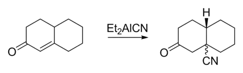 Diethylaluminium cyanide is used for the stoichiometric hydrocyanation of α,β-unsaturated ketones. The reaction is influenced by the basicity of the solvent. This effect arises from the Lewis acidic qualities of the reagent.[9] The purpose of this reaction is to generate alkylnitriles, which are precursors to amines, amides, carboxylic acids esters and aldehydes.