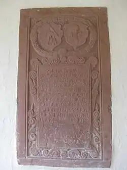 Dietrich Koger (24 March 1608 - 27 November 1688) was a magistrate who served as Mayor and Vogt of Auggen, Holy Roman Empire (present day Germany) from 1629 until 1661. Prior to 1629, Koger served as Sergeant-at-Arms of Weil am Rhein. Dietrich Koger is the son of magistrate, and former Vogt of Weil am Rhein, Nicholas 'Claus' Koger. Dietrich Koger was married twice, the first to Maria Leininger on 24 August 1629 - daughter of Hans Leininger, until her death on 30 April 1643 during pregnancy. Koger's second wife, Anna Hagin, was daughter of the Vogt of Tannenkirch, George Hagin. In the mid-seventeenth century, Koger became the first magistrate to affix a seal with his own crest and coat of arms depicting a plough and vine-knife.[1] During the 30 Years War, Koger and Paster Jeremias Gmelin were credited with bringing peace to Auggen-Baden, and rebuilding the village. His epitaph on the West Cemetery Wall in Auggen still shows the arms and crest of Koger; Koger's coat of arms eventually was inspired and adopted as the town of Auggen's coat of arms. At the time of his death in 1688 Koger had 18 children.[2] A street in Auggen, Germany still bares his name: Dietrich-Koger-Straβe, 79424 Auggen, Germany. Koger's tomb is located at St. Pankratiuskirche Cemetery, Auggen.[3]