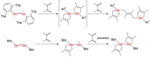 - ^ a b Stender, Matthias; Phillips, Andrew D.; Power, Philip P. (2002-05-30). "Formation of [Ar*Ge{CH2C(Me)C(Me)CH2}CH2C(Me)]2 (Ar* = C6H3-2,6-Trip2; Trip = C6H2-2,4,6-i-Pr3) via reaction of Ar*GeGeAr* with 2,3-dimethyl-1,3-butadiene: evidence for the existence of a germanium analogue of an alkyne". Chemical Communications (12): 1312–1313. doi:10.1039/B203403D. ISSN 1364-548X. PMID 12116985.