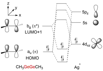 Noticing that the au(π) bonding orbital in digermynes has the ability to act as the π-electron donor, Ar1GeGeAr1 can react with AgSbF6 to form [AgAr1GeGeAr1]+SbF6− at -40 °C.[16] [AgAr1GeGeAr1]+ has a C2 axis through the silver atom which is perpendicular to the CGeGeC plain and the midpoint of the Ge-Ge bond. The silver atom is coordinated by two Ge atoms and two arenes from Dipp groups of the bulky protecting groups. The bond between GeGe moiety and Ag+ is dominated by the interaction between the HOMO of Ar1GeGeAr1 and 5s and 5p orbitals of Ag+, which claims the σ-character of the interaction, while the π-character can be explained by the relative weak interaction of Ag 4dxz orbital with π* orbital (LUMO+1). Therefore, it has been suggested that [AgAr1GeGeAr1]+ is a hybrid of π-complex and a metallacyclopropene-like σ-complex.