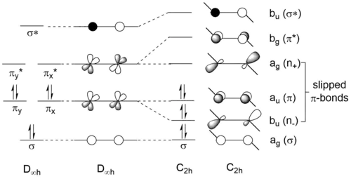 In a molecular orbital (MO) description, the geometrical distortion (trans-bent structure) of digermynes is the consequence of the second order Jahn-Teller (SOJT) effect, which is the symmetry allowed interaction between filled bonding MO (generally the HOMO in digermynes) and empty nonbonding or antibonding MOs (usually the latter one) that are close in energy and can lead to large molecular distortion. If constraining the digermyne molecule in D∞h point group, two Ge atoms will form one low-lying σ-bonding orbital, two degenerate π-bonding orbitals and π-antibonding orbitals, and one high-lying σ-antibonding orbital, which are the same as alkynes. SOJT mixing of in-plain π-bonding orbital (πx, HOMO) and σ-antibonding orbital, which have the same bu symmetry in the trans-bent C2h point group, give rise to a slipped π-bond with significant non-bonded electron lone pair character which is lower in energy, as well as a σ-antibonding orbital with higher energy. This second order mixing of MOs leads to the molecular distortion in geometry from linear D∞h to trans-bent C2h. The mixing of σ-bonding orbital and in-plain π-antibonding orbital (πx*, LUMO) is also symmetrically (both are in bg symmetry) and energetically allowed. Noticing that large SOJT effect occurs between two orbitals with energy difference of 2 eV or even larger, for example, 4 eV, the extent of mixing of orbitals is neglectable in alkynes, but is maximized in heavier elements, like Ge atoms in digermynes.[12]