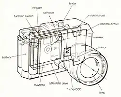 The first prototype filmless SLR camera was publicly demonstrated by Sony in August 1981. The Sony Mavica (a magnetic still video camera) used a color-striped 2/3” format CCD sensor with 280K pixels, along with analog video signal processing and recording.[6] The Mavica electronic still camera employed a TTL single-lens reflex viewfinder, as shown in the graphic from a June 1982 Sony press release. It recorded FM-modulated analog video signals on a newly developed 2” magnetic floppy disk, dubbed the "Mavipak".