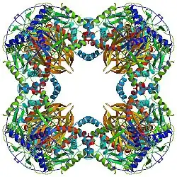 7. ^ a b c PDB: 1B5S​; Izard T, Aevarsson A, Allen MD, Westphal AH, Perham RN, de Kok A, Hol WG (February 1999). "Principles of quasi-equivalence and Euclidean geometry govern the assembly of cubic and dodecahedral cores of pyruvate dehydrogenase complexes". Proc. Natl. Acad. Sci. U.S.A. 96 (4): 1240–5. Bibcode:1999PNAS...96.1240I. doi:10.1073/pnas.96.4.1240. PMC 15447. PMID 9990008.