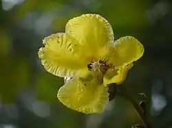 The flowers bloom on long peduncles facing downwards, 8–13 cm (3.1–5.1 in) wide, and yellow in colour. They have no scent and no nectar. The flower blooms daily at around 3 am and opening flowers are fully opened one hour before sunrise.[3] They are pollinated by bees, small beetles as well as flies that scramble over them. They point up when they produce and develop fruit after they are pollinated, the fruits take up to 5 weeks to fully develop.[4]