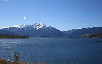 The idea to dam the Blue River and divert the water to Denver originated in the early 1900s. The Denver Water Board acquired most of the land needed for the reservoir for the price of back taxes during the Great Depression when many Dillon residents were unable to pay property taxes. By then, the board had already acquired most of the water rights in the valley; in 1956, it notified the remaining residents and business owners they must sell and leave by September 15, 1961.[3] Dam construction began in 1961 and was completed in 1963.[4] The dam is earth-filled, 5,888 feet (1.12 mi; 1.79 km) in length, and rises 231 feet (70 m) above the Blue River stream bed.