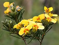 Dillwynia glaberrima commonly known as the smooth parrot-pea,[2] is a flowering plant in the family Fabaceae. It is a small upright shrub with liner leaves and clusters of yellow flowers.