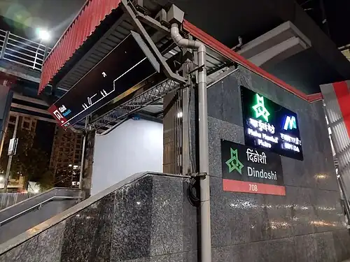 Dindoshi is an elevated metro station on the North-South corridor of the Red Line 7 of Mumbai Metro in Mumbai, India. This metro station was inaugurated on 2 April 2022 by Prime Minister Narendra Modi. [1][2][3]