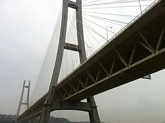The Dingshan Bridge is a cable-stayed bridge which crosses the Yangtze River in Chongqing, China. Completed in 2013, it has a main span of 464 metres (1,522 ft). The bridge carries 6 lanes of road traffic of China National Highway 212 on the upper deck and Line 5, Chongqing Rail Transit between the Jiangjin District south of the Yangtze River and the Jiulongpo District to the north.[1]