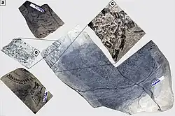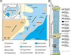 Until at least the end of the Middle Triassic, high sea levels enabled shallow water to cover much of the South China Block,[45][46] a tectonic plate that today consists of the stable Yangtze Craton and the less stable South China Fold Belt. A mountain-building event known as the Indosinian orogeny uplifted Precambrian rocks to form four major landmasses on the South China Block: Khamdian to the west, Jiangnan in the centre, Yunkai to the south, and Cathaysia to the east. Island chains also stretched between Yunkai and Cathaysia in the east. Located between Khamdian and Jiangnan was a deep oceanic basin known as the Nanpanjiang Basin.[46][47][48] Along the western edge of this basin, fossil-bearing sediments were laid down to become what are now the Lagerstätten (sedimentary deposits characterized by exemplary preservation) of Panxian, Luoping, and other localities.[4]