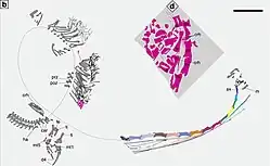 Dinocephalosaurus had relatively large legs terminating in flipper-like feet. The forelimbs and hindlimbs are roughly the same length, unlike Tanystropheus where the forelimbs were much smaller.[16] Whereas most protorosaurs, such as Tanystropheus, Macrocnemus, and Langobardisaurus, had relatively ossified limbs adapted for terrestrial life, the stout limbs of Dinocephalosaurus were poorly ossified and resembled those of nothosaurs. Out of the carpal bones, only six were ossified; similarly, only three of the tarsal bones were ossified. Additionally, the astragalus and calcaneum also did not articulate with each other in the ankle, instead forming simple and rounded ossifications.[2][3] Another adaptation to aquatic life was the loss of an opening known as the thyroid fenestra in the pelvis due to the rounded pelvic bones, which was also present in Fuyuansaurus.[9]