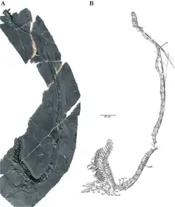 The fauna of Luoping appears to have been preserved in a small intraplatform basin instead of the surrounding open water, judging by the anoxic sediments present at the site.[4] Out of 19,759 specimens, 93.7% of the fossils found at Luoping are arthropods: decapods, isopods, crab-like cycloids, shrimp-like mysidaceans, clam shrimp, and ostracods, as well as rare millipedes and horseshoe crabs. By comparison, only 0.07% of specimens come from marine reptiles,[51] which include Dinocephalosaurus and Pectodens alongside the mixosaurians Mixosaurus cf. panxianensis and Phalarodon atavus; the pachypleurosaurs Dianmeisaurus gracilis and Dianopachysaurus dingi; the saurosphargids Largocephalosaurus polycarpon and Sinosaurosphargis yunguiensis; the nothosaurs Nothosaurus zhangi and a species of Lariosaurus; other sauropterygians Atopodentatus unicus, Dawazisaurus brevis, and Diandongosaurus acutidentatus; and an archosaur related to Qianosuchus.[4][52] Otherwise, fish including saurichthyids, palaeoniscids, birgeriids, perleidids, eugnathids, semionotids, pholidopleurids, peltopleurids, and coelacanths have been found at Luoping, forming 3.66% of fossils with 25 taxa in 9 families. Molluscs such as bivalves and gastropods, along with ammonoids and belemnoids, account for 1.69% of specimens. Rare and probably non-endemic fossils also include echinoderms such as crinoids, starfish, and sea urchins; branchiopods; and relatively complete conifer branches and leaves, which probably originated from coastal forests less than 10 km (6.2 mi) away.[51]