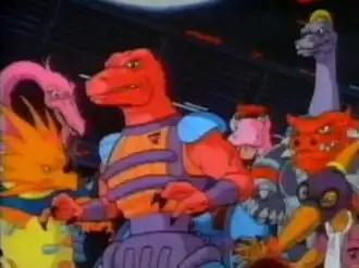 Dinosaucers is a 1987 animated television series co-produced in the United States and Canada; developed and produced by DIC Animation City in association with Lightyear Entertainment and Coca-Cola Telecommunications.[1] The show was created by producer Michael E. Uslan, who considered it a "harebrained idea".[2] Despite only running for one season, it did run for a total of 65 episodes as ordered to be a 13-week-long series, when it aired on first-run syndication.[3]