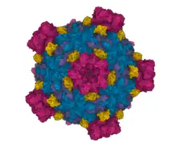 | Cryo-EM reconstruction of Fako virus capsid showing: turret protein (red), clamp protein (yellow), and homodimer of major capsid protein (blue/purple) | |