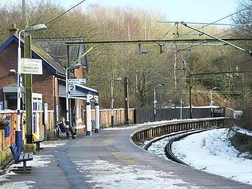 For most of the day, all trains use platform 2; however, in the rush hour, platform 1 is the departure platform for services to Glossop via Hadfield, with platform 2 being used for trains to Manchester Piccadilly (although this can reverse with trains to Hadfield via Glossop departing from platform 2 and Manchester Piccadilly services using platform 1). Two further platforms survive, but both are out of use and fenced off; these are the old eastbound mainline platform towards Hadfield and that formerly used by Manchester-bound trains on the Glossop branch. Buildings still stand on each one, though neither is now in rail use.[1] There are also buildings on platform 1 and a signal box that controls the triangular junction and single lines to both termini.