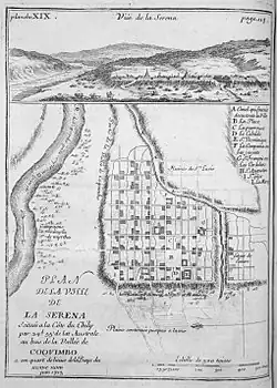 La Serena was founded on the orders of the Spaniard Pedro de Valdivia in order to provide a sea link to maintain permanent contact between Santiago and Lima in the Viceroyalty of Peru. For this he would need a place for his troops to rest and eat. The village was founded by captain Juan Bohón with the name "Villanueva de La Serena". Although the exact date is disputed, probable dates include 15 November or 30 December 1543 and 4 September 1544.[1] Many historians simply say that it was founded in 1544. Five years later, from the night of 11 January 1549 until the following day, a native uprising totally destroyed and burned the village, killing nearly every Spaniard. Pedro de Valdivia ordered Captain Francisco de Aguirre to re-establish the city later the same year on 26 August under the name of San Bartolomé de La Serena (now patron saint of the city), in the same place where the Plaza de Armas stands today. A few years later, on 4 May 1552, King Charles I of Spain by royal decree gave it the title of city.[1] One of the reasons to establish La Serena was to control Mapuche groups that had begun to migrate north following the Spanish founding of Santiago in 1541.[5] Indeed, northern Mapuche groups appear to have responded to the Spanish conquest by abandoning their best agricultural lands and moving to remote parts away from the invaders.[6][7]