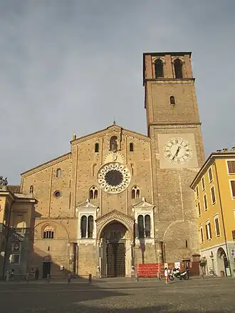 After the complete destruction of Lodi (Laus Pompeia) in 1111, a new cathedral was begun on 3 August 1158. In January of that year, every inhabitant of Lodi above the age of fifteen had been required to swear fidelity to Milan. Those who had refused, were expelled on 22 April 1153.[27] The cathedral was completed, except for the façade, in 1163, and the remains of Bishop Bassianus reburied in the crypt, in the presence of Antipope Victor IV and the Emperor Frederick Barbarossa.[28] Originally dedicated to Bassianus, the new cathedral acquired the dedication to the taking up (Assumption) of the physical body of the Virgin Mary into heaven. Bishop Alberico di Merlino (1160–1168), who had joined the imperial schism, was excommunicated by Cardinal Joannes de Anagnia, the papal Legate, on 12 March 1160.[29] Albericus was expelled from Lodi by the forces of Pope Alexander III in 1168.[30]
