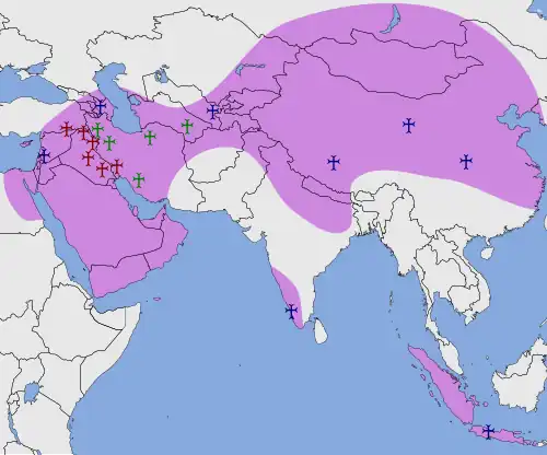 Canon XXI of the synod of 410 provided that 'the bishops of the more remote dioceses of Fars, the Islands, Beth Madaye [Media], Beth Raziqaye [Rai] and also the country of Abrashahr [Nishapur], must later accept the definition established in this council'.[6] This reference demonstrates that the influence of the Church of the East in the 5th century had extended beyond the non-Iranian fringes of the Sassanian empire to include several districts within Iran itself, and had also spread southwards to the islands off the Arabian shore of the Persian Gulf, which were under Sassanian control at this period. By the middle of the 6th century, the Church's reach seems to have spread well beyond the frontiers of the Sassanian empire, as a passage in the acts of the synod of Aba I in 544 refers to East Syriac communities 'in every district and every town throughout the territory of the Persian empire, in the rest of the East, and in the neighbouring countries'.[15]