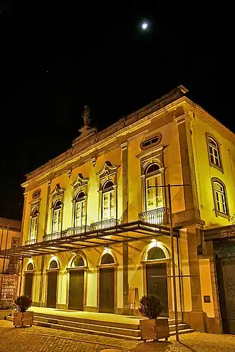 The theatre is flanked and integrated into the centre of the town in an area of paved stonework and granite structure, behind the Church of Santo António dos Capuchos, near the Lima River and along the Avenida dos Plátanos.[1] The principal facade is preceded by a platform of granite slabs accessible by three stairs, and flanked by two iron gates between granite pilasters.[1]