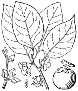 The common persimmon is a generally small to medium sized tree, usually 30 to 80 feet (9 to 24 m) in height, but reaching 115 feet (35 m) west of the southern Mississippi.[8] It has a short, slender trunk and spreading, often pendulous branches, which form a broad or narrow, round-topped canopy. The roots are thick, fleshy and stoloniferous. The species has a shrubby growth form.[8] The plant has oval entire leaves, and unisexual flowers on short stalks. In the male flowers, which are numerous, the stamens are sixteen in number and arranged in pairs; the female flowers are solitary, with traces of stamens, and a smooth ovary with one ovule in each of the eight cells—the ovary is surmounted by four styles, which are hairy at the base. The fruit-stalk is very short, bearing a subglobose fruit an inch in diameter or a bit larger, of an orange-yellow color, ranging to bluish, and with a sweetish astringent pulp. It is surrounded at the base by the persistent calyx-lobes, which increase in size as the fruit ripens. The astringency renders the fruit somewhat unpalatable, but after it has been subjected to the action of frost, or has become partially rotted or "bletted" like a medlar, its flavor is improved.[9]