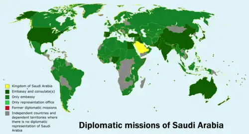 This is a list of diplomatic missions of Saudi Arabia. Ibn Saud established the General Directory for the Foreign Affairs in 1926. Four years later it was given ministry status, even though it had a staff of fifteen employees in total and no diplomatic missions abroad. In 1936, Saudi Arabia had five missions–in London, Baghdad, Damascus, Geneva, and Cairo–and fifteen years later this number jumped to sixteen. Saudi Arabia now has an extensive diplomatic presence worldwide.
