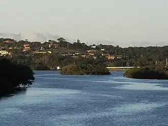Meanwhile, Rainbow Serpent reaches Evans Head. Dirawong is nowhere to be seen, so Rainbow Serpent decides to go back west. He then goes into the Evans River and coils himself around, creating Snake Island. As he turns, his body makes a larger island in the river, now known as Pelican Island.