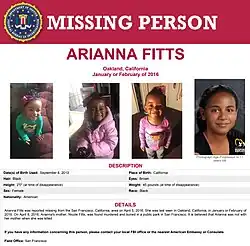 Arianna Fitts[1] (born September 6, 2013) is an American child missing since 2016. Arianna and her mother, Nicole Fitts (then aged 32), were reported missing on April 5, 2016, in San Francisco, California. Nicole was last seen on April 1, 2016, and Arianna has not been seen since mid-February 2016. Arianna is still missing, while her mother's body was discovered buried in McLaren Park on April 8, 2016.[2]