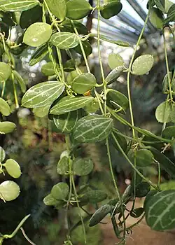 Dischidia ovata, commonly called watermelon dischidia (pronounced /dɪsˈkɪdiə/), is a small vine in the frangipani and hoya family Apocynaceae, native to New Guinea and Cape York Peninsula, Australia.[3] The species name ovata refers to its ovate leaves, its common name refers to the leaf venation that resembles a watermelon rind. The species is succulent and grows as an epiphytic or lithophytic vine in a variety of habitats.[3][4]