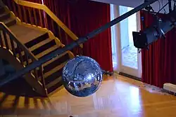 A disco ball and spotlight in the Fishbowl of Currier House.