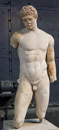 The Discophoros, also spelled Discophorus (Greek – "Discus-Bearer"), was a bronze sculpture by the classical Greek sculptor Polyclitus, creator of the Doryphoros and Diadumenos, and its many Roman marble copies. It is not, however, to be confused with Discobolus of Myron, which shows a discus being thrown, not carried.