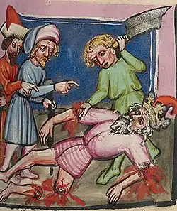 Thus, the imperially approved way to dismember the convict within the Holy Roman Empire was by means of cutting, rather than dismemberment through ripping the individual apart. In paragraph 124 of the same code, beheading prior to quartering is mentioned as allowable when extenuating circumstances are present, whereas aggravating circumstances may allow pinching/ripping the criminal with glowing pincers, prior to quartering.[5]