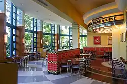 There are five restaurants in the hotel. Chef Mickey (the main restaurant) has an international cuisine buffet, while Hollywood & Dine has quick-service food and beverages. Studio Lounge is a full-service bar with specialty drinks and snacks. The Sunset Terrace opens seasonally, with outdoor BBQ cuisine. The Piano Pool Bar sells drinks to guests sitting around a piano-shaped pool. The Piano Pool also has a side toddler pool, with a slide.
