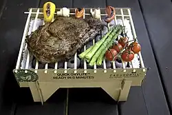 To start the grill, the user removes the outer packaging and lights the corner of the starter sheet. The sheet will ignite the charcoal and continue to burn for about 15 minutes, heating the charcoal. No lighter fluid is required. When the coals reach an even and optimal temperature, any food types which are commonly grilled can be placed on the grill top and cooked, including steaks, seafood, chicken, kebabs, vegetables, burgers and sausages.