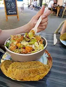 A number of manufacturers are now making disposable foodservice products from a combination of natural starches, recycled fibers, water, air, and natural minerals.[7] These composite products include cups, plates, bowls, cutlery, sandwich wraps, food containers and trays. Ideally these products are easily biodegradable and composted after use.